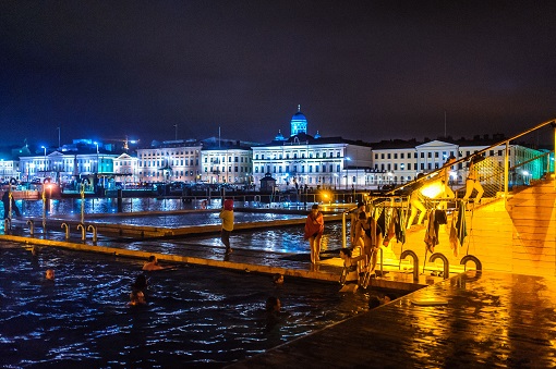 拍摄者: Harri Tarvainen, VisitFinland  芬兰北部冰屋桑拿 如今,大多数桑拿都是私人拥有,但在规模较大的城市也仍有公共桑拿。公共桑拿为旅游者提供了体验桑拿文化的机会,那怕你在赫尔辛基只呆上几个小时。 Allas Sea Pool是一座海水浴场,位于赫尔辛基市中心,毗邻集市广场。Allas Sea Pool有三个游泳池,海水游泳池,温水游泳池和儿童游泳池。温水游泳池和海水游泳池全年开放,海水池的温度与海中的温度相同,在夏季,海水池有温暖的水,在冬季,您可以体验正宗的冰水游泳。温水池中是加热的自来水,全年水温保持在28摄氏度。 Allas Sea Pool有三间电加热的桑拿房,女士桑拿房,男士桑拿房和可以预订的私人活动桑拿室。这里除了游泳,桑拿还有餐厅和咖啡厅。经常举办康体运动课程,桑拿瑜伽和文化活动,是一个城市中心的休闲活动的理想去处。 拍摄者: Eero Ahanen, VisitFinland  赫尔辛基桑拿日Allas sea pool